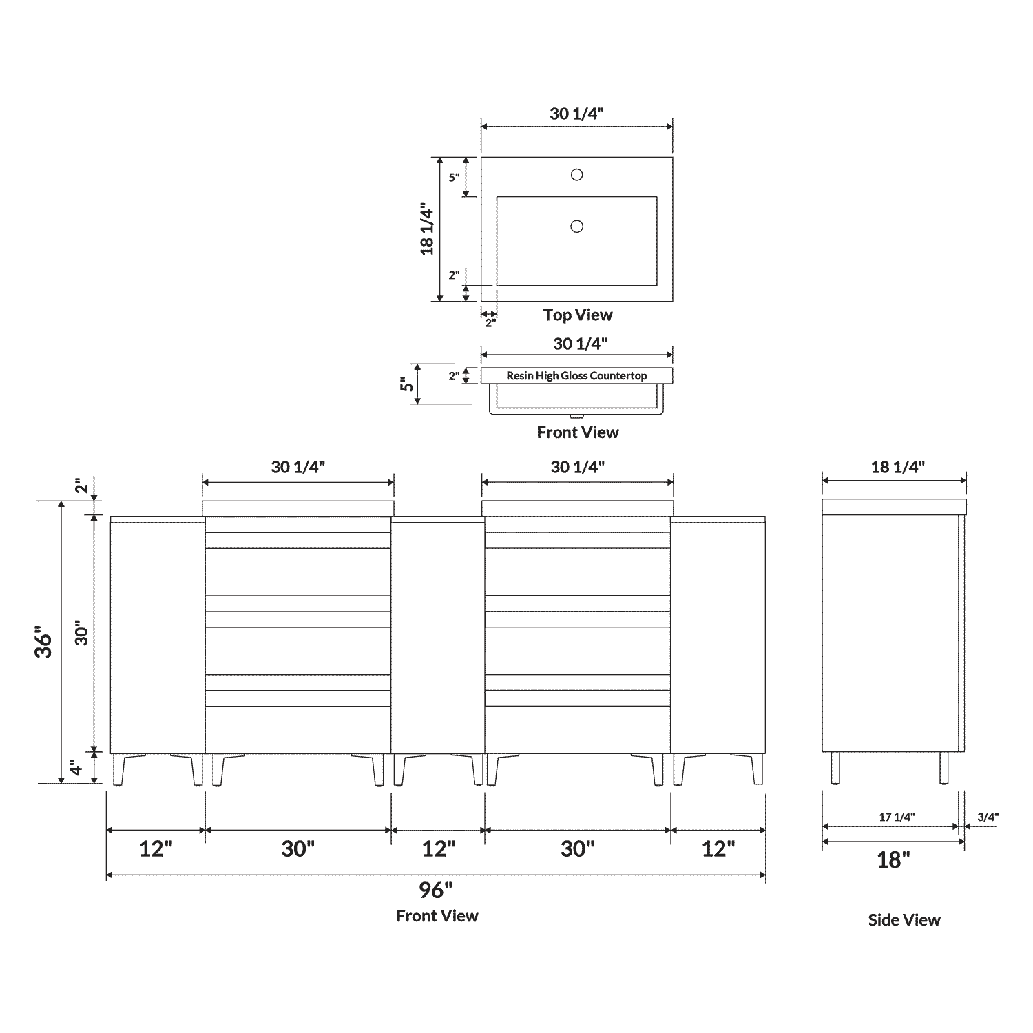 • Sink base: 30"W x 18"D x 36"H (2 cabinets included)